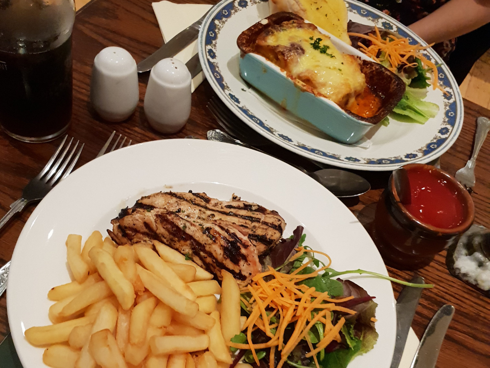 Ian had the chargrill chicken and Ellie opted for a crisp lasagne which had a tangy tomato filling. We both agreed the service was excellent. On the table next to us were two elderly members from the Meads community celebrating their wedding anniversary.